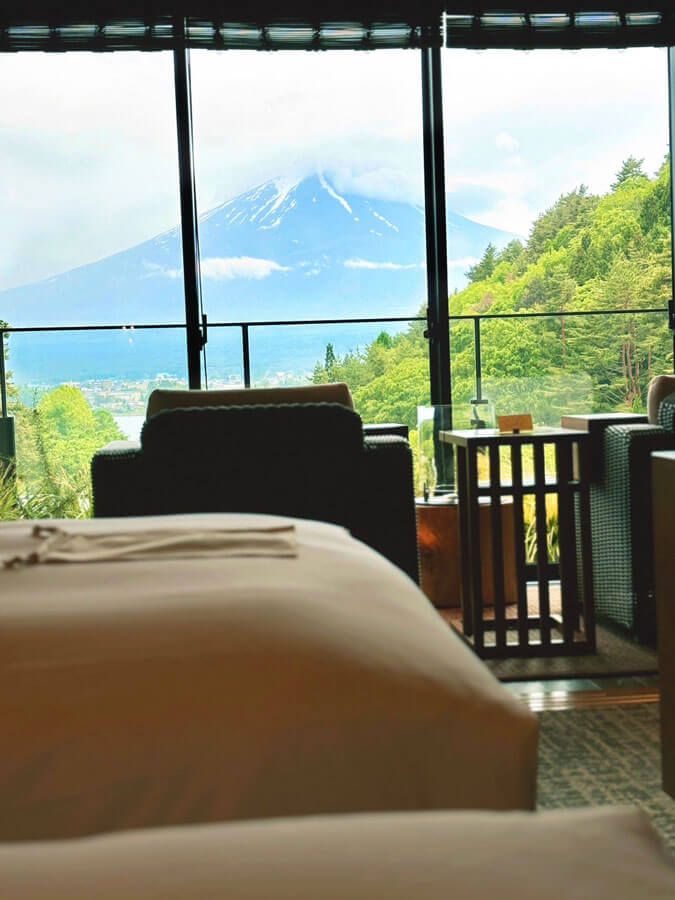 「ふふ 河口湖」は、なんと言っても富士山を一望できるお部屋が魅力です。すべての部屋が富士山を楽しめるスイートルームで、富士山と森の中で、春夏秋冬の移り変わりを楽しむことができます。