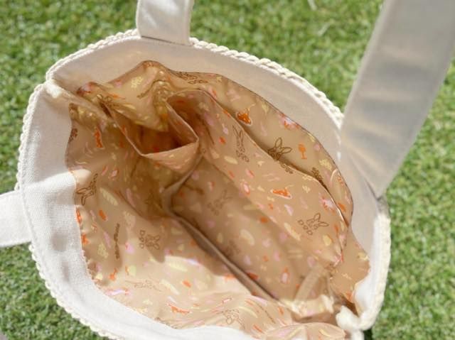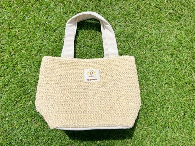 トレンドのストロー風の素材を使用した夏らしい「かごバッグ」。タグにはコラボロゴ、裏地にはコラボ総柄をデザインした限定感たっぷりのトートです。