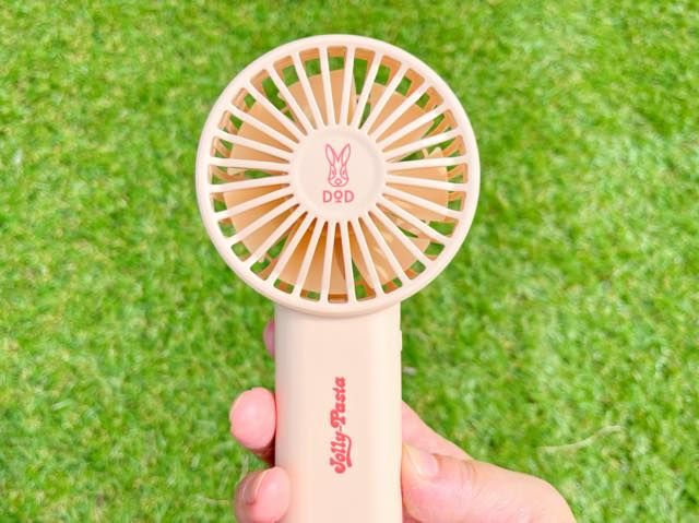 かごバッグの内ポケットにもすっぽり収まるような可愛らしいサイズのハンディファン。手首に通せて安心なストラップ付きです。重さを計ってみると92gと軽く、かさばらないので持ち運びに便利。風量もあるので涼しく快適です。