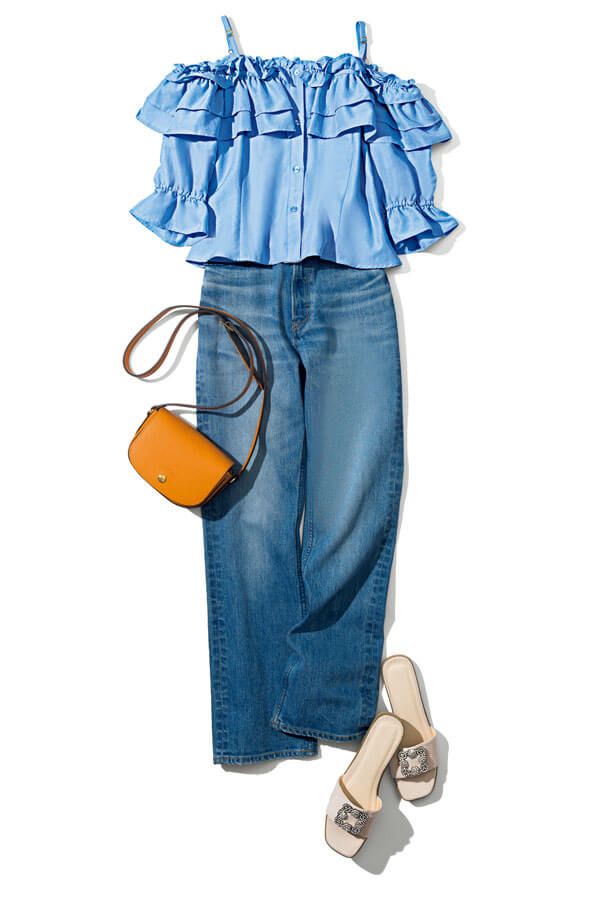 ロマンティックなフリルブラウスに肌見せで刺激をON。デコルテ&肩を露出することで、フリルたっぷりな水色ブラウスに大人のスパイスをひとふり。デニムでリラックス感を加えれば、こなれた休日コーデが完成。