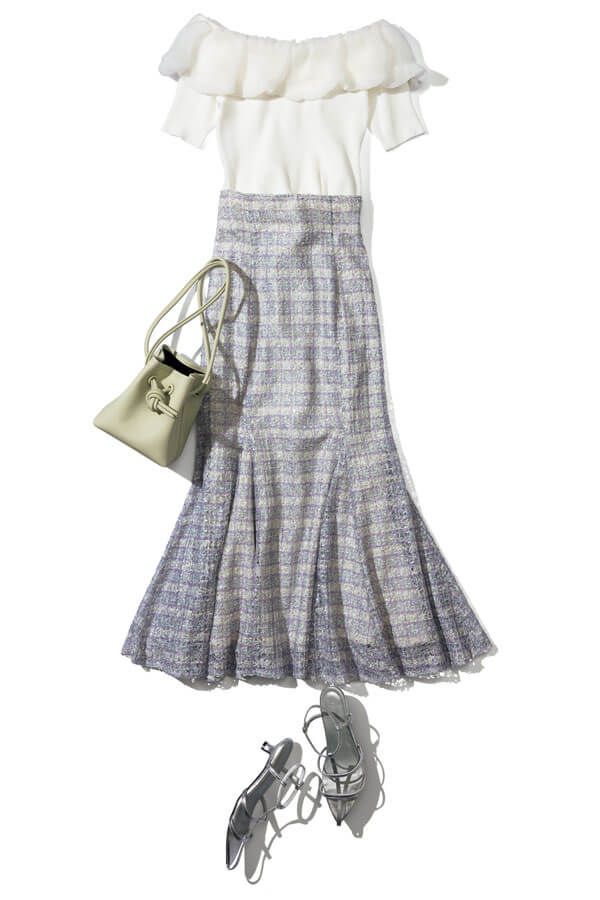 チュールからのぞかせたデコルテで優しげフェミニンに。ニットで肌見せしているぶん、ボトムはチェックのマーメイドスカートでグッドレディに。