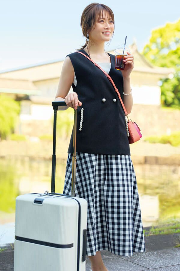 ジレ¥28,600/レッセ・パッセ アンサンブル(ノースリニットのみ着用)¥19,800/ジャスグリッティー スカート¥22,000/アンタイトル ピアス¥23,100/masae(ロードス) ブレスレット¥9,350/ココシュニック オンキッチュ(ココシュニック) バッグ¥56,100/ケイト・スペード ニ ューヨーク(ケイト・スペード カスタマーサービス) キャリーケース¥62,700/FRAY I.D×Samsonite(FRAY I.D)