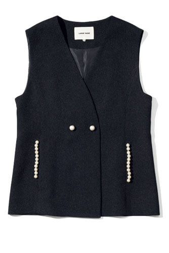 ノースリニットをインして涼しげに着るジレが新鮮。腕をスッキリ出し、モノトーンをさわやかテイストに。