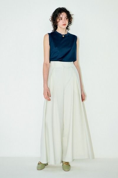 タックワイドパンツ 46,200円/スタンブリー(ヒューエルミュージアム) ネイビートップス 8,580円/スローン(ザ ショップ スローン 新静岡セノバ店) ネックレス 45,100円/マリハ シューズ 14,960円/A de Vivre パンツながらスカート見えする女性らしい注目の形。