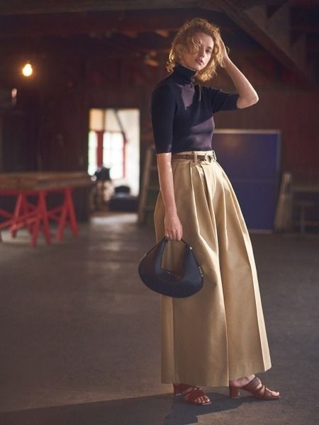 ダイナミックなすそと締まったウエストとの対比が下半身のカムフラージュに有効。ボリュームを下に落とすしなやかさや、肉感を拾わないボンディングのようなふっくら感など。脚の形を目立たせない素材にまでこだわれば、いっそう美しいたたずまいを約束。