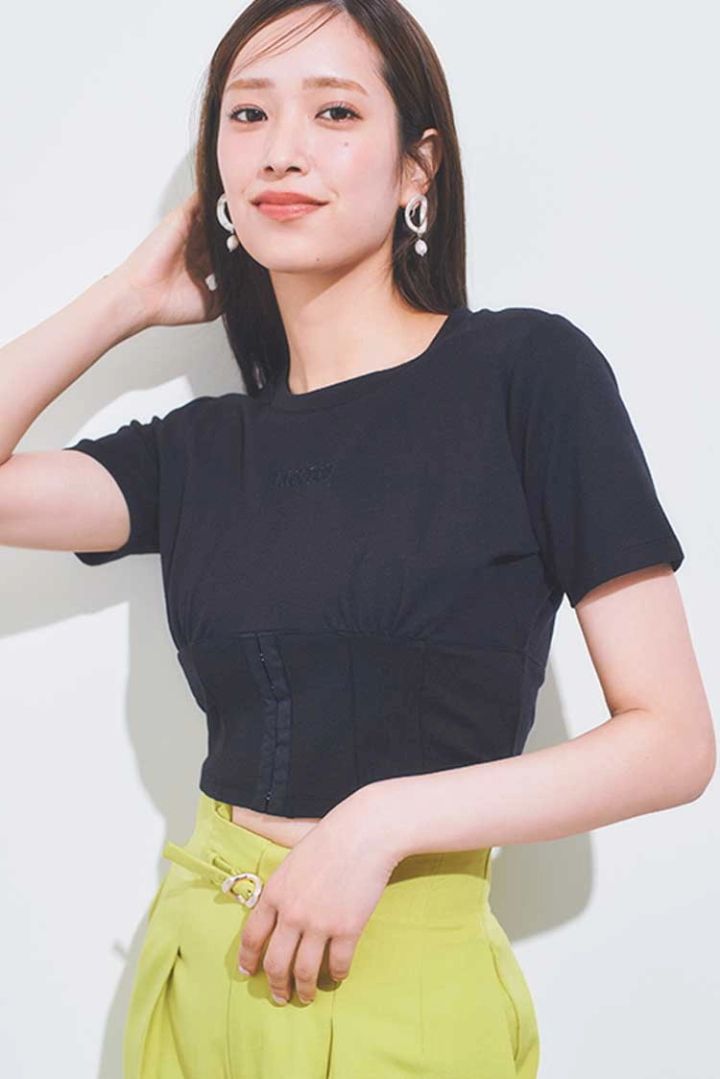 クロップド丈&コルセット風デザインでウエストがすっきり見え、女っぽいシルエットに。カラーアイテムと相性抜群♡