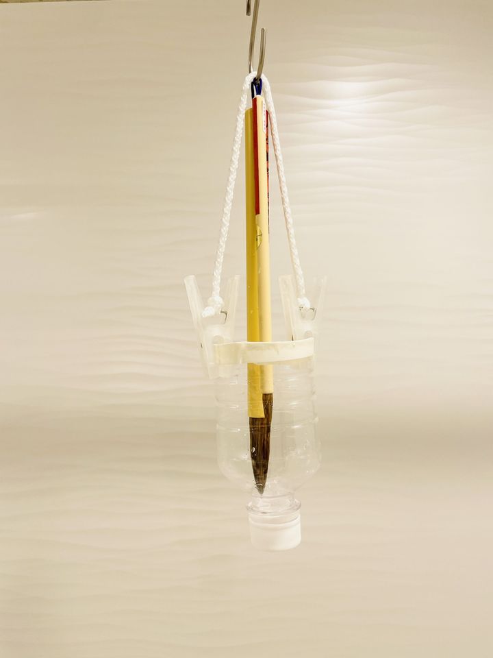 ・S字フックを筆を乾かす場所にかけ、そこに筆(持ち手の上部に小さな輪っか状の紐が付いています)、先ほどのペットボトルに取り付けた紐を、一緒に引っかける。