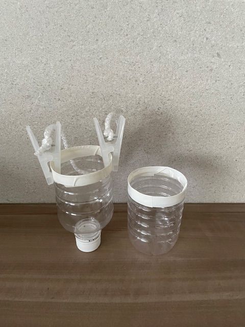 ・蓋が付いている方(飲み口側)のペットのボトルの適当な位置に洗濯ばさみを取り付ける。