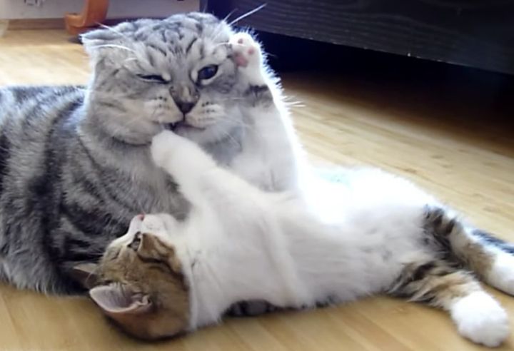 ムキになって、大人猫さんの顔をムギュッと押したり