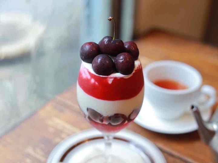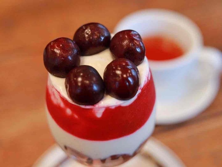 大きさのそろったチェリーがきれいにトッピングされ、大豆ヨーグルトとベリーソースが美しく層を成すパフェ。抜群にかわいくてストイックなデザインに驚きました。