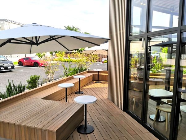店内のカフェスペースの他に外にテラスもあり。駐車場も広いので気楽に訪れやすいです。