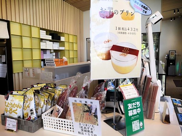 店舗限定の「お芋のプリン」、自社栽培のさつまいも(紅あずま)もありました。