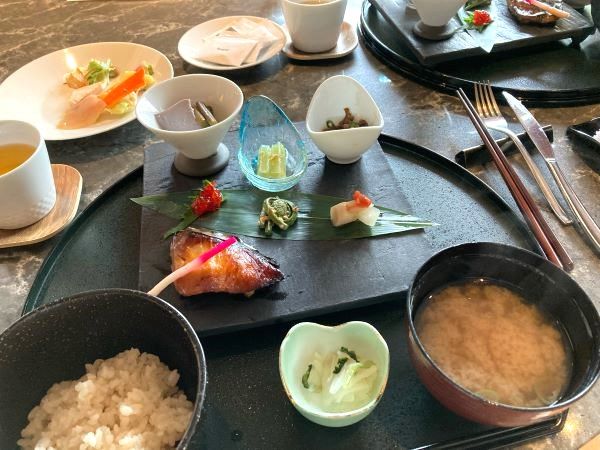 筍の炊き込みご飯と青森県産しじみの味噌汁に焼き魚、すじこ、本日の山菜など、どれも美味しかったです。