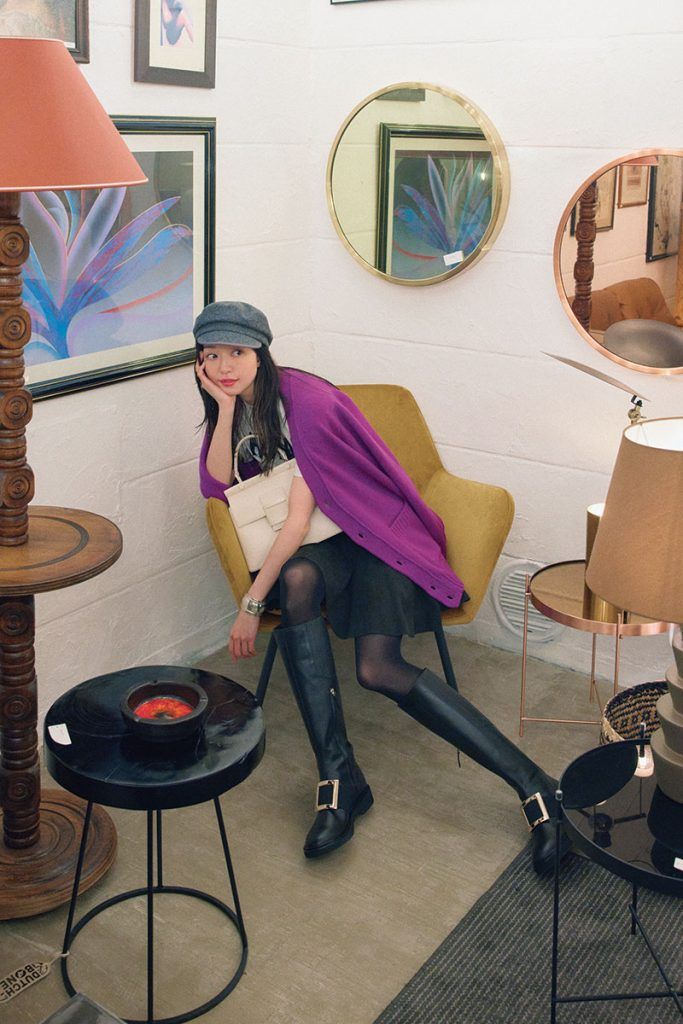モノトーンにビビッドカラーを効かせたミニスカコーデ。キャスケットで洒落感をプラス。スカート¥60,500(THIRD MAGAZINE)ブーツ¥270,600バッグ¥377,300(ともにロジェ ヴィ ヴィエ/ロジェ・ヴィヴィエ・ジャパン)カーディガン¥36,300(スローン)Tシャツ¥9,900(バウム・ウンド・ヘルガーデン/アルアバイル)帽子¥24,200〈マサカズ フルサワ〉バングル¥88,000〈フォークバイエヌ〉(ともにUTSPR)ネックレス¥30,800(マリハ)