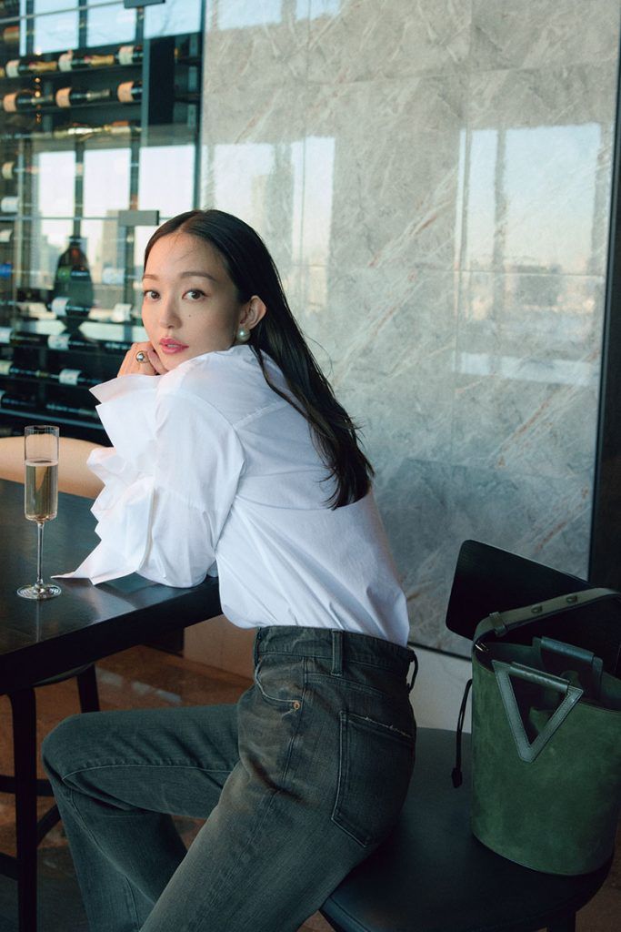 ブラウス¥36,300(EVA MANN/THIRD MAGAZINE)デニムパンツ¥20,900(レッドカード/ゲストリスト)バッグ¥322,300(ロジェ ヴィヴィエ/ロジェ・ヴィヴィエ・ジャパン)ピアス¥5,940(アビステ)ネックレス¥9,900バングル¥6,330(ともにエイチアッシュ/フォーティーン ショールーム)リング¥33,000(ルフェール/UTS PR)
