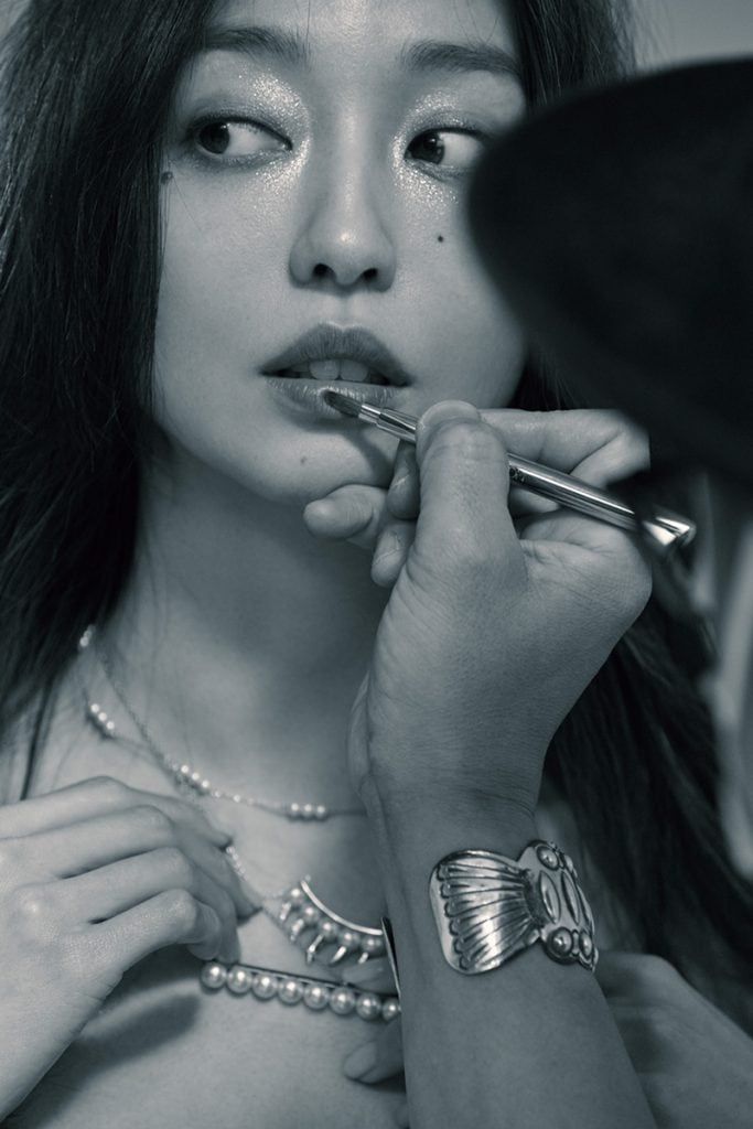 敬一 メークは胸元のパールからインスパイアされたパーリーなハイライトがアクセント。ヘアはエレガントにしすぎず、ストレートをベースにかなりラフな感じにしてみた。