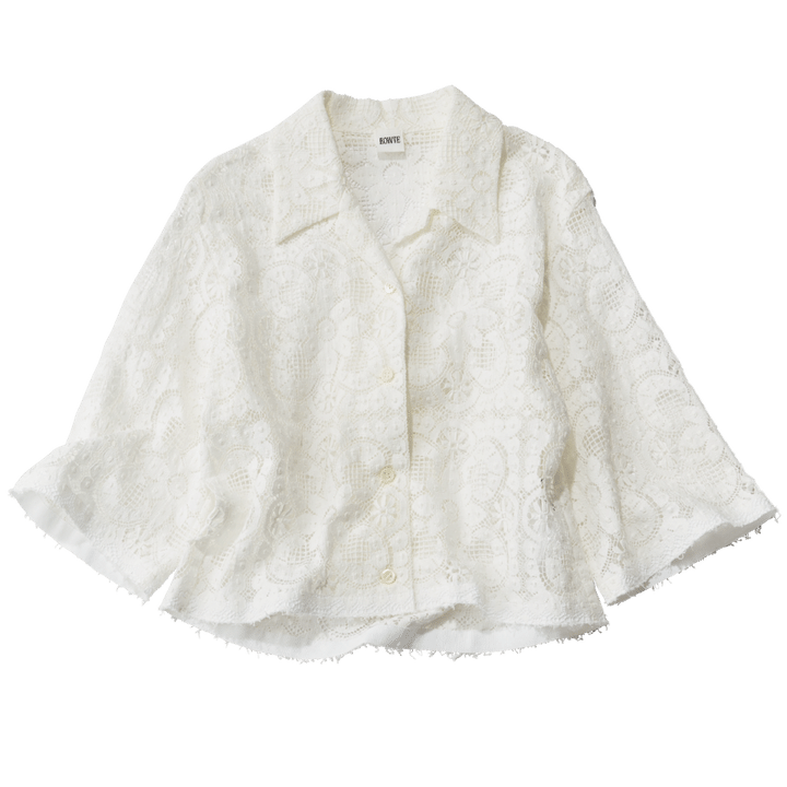 「レースって永遠に好き♡ バウトのこちらはまるでヴィンテージのようで、縫製も美しく、うっとりしちゃいます。開襟シャツだから甘くなり過ぎず、カジュアルに着られていい!」