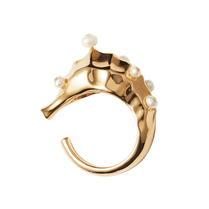 「今年は辰年ということもあり、縁起がよさそうなリングが気になって。 独特の有機的なフォルムにいびつなパール、タツノオトシゴをこんなにモードに再現できるのはさすがララガン」