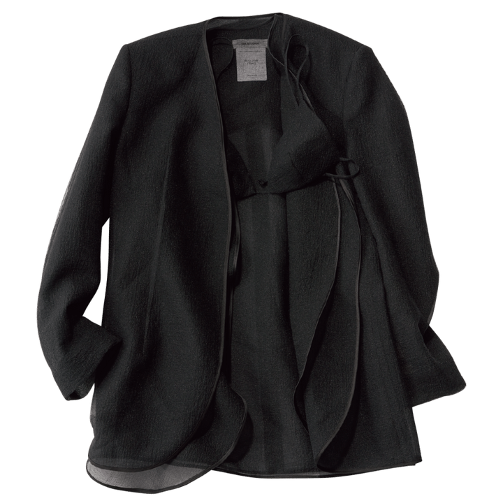 「ブラトップ、ベスト、ジャケットの3ピースは、シンプルなリブタンクに重ねて着るイメージ。それぞれバラバラに使ってもいいし、大人っぽく上品に着られる透けアイテムです」