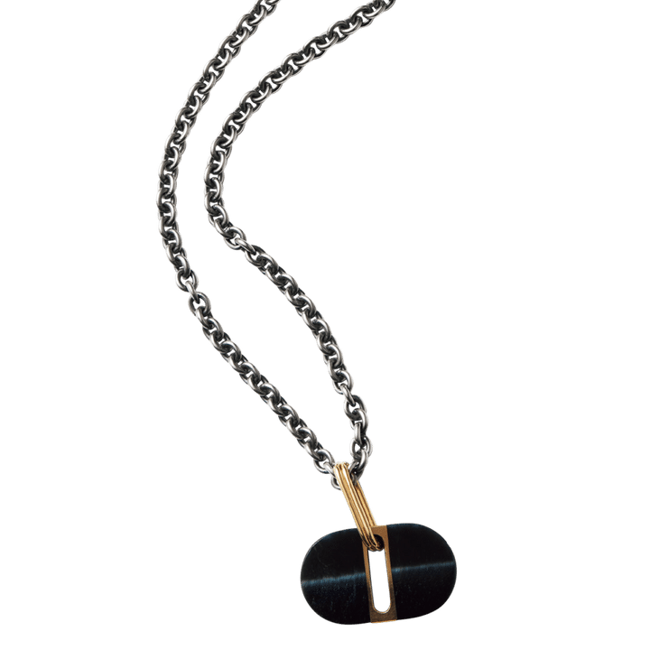 チェーンネックレス[SV×K18YG]¥144,100、チャーム[K18YG×ブルータイガーアイ]¥157,300(共にヒロタカ/ヒロタカ 表参道ヒルズ)