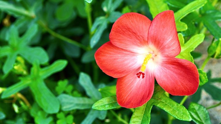 ラッパのように広がる大きな花びらと、飛び出た花柱が特徴的な花です。 「ブッソウゲ」という和名よりも、「ハイビスカス」という名前の方がよく知られています。