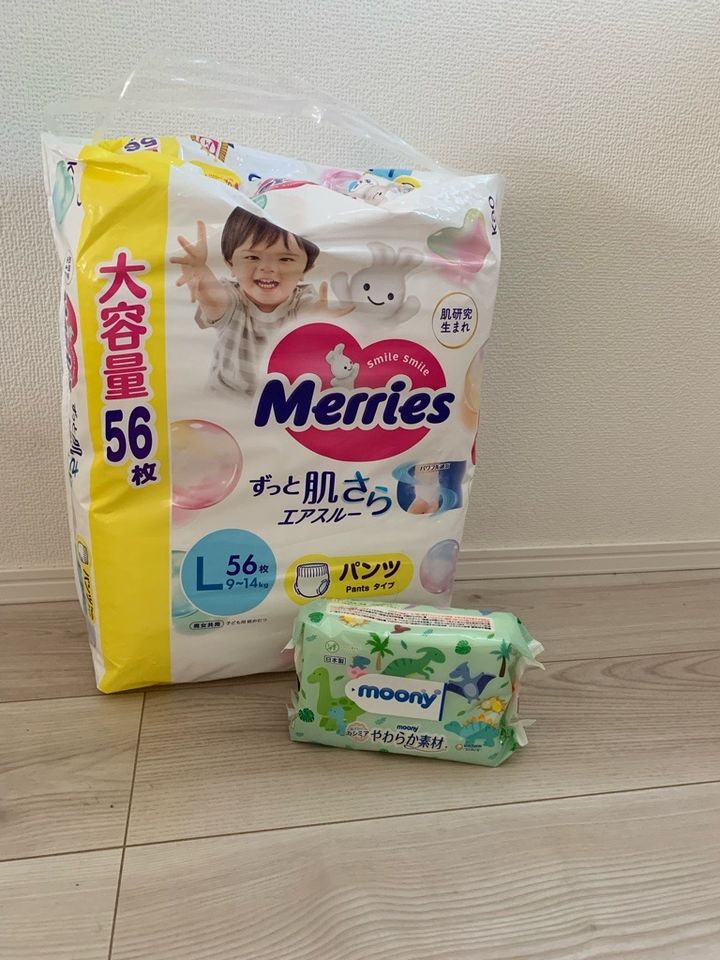 いつも使っているメリーズのおむつとムーニーのお尻拭きがあったため、そちらを選びました。