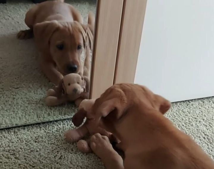 3. 子犬「ぬいぐるみ、どうぞ!」鏡の中の自分を見た反応が可愛すぎ!