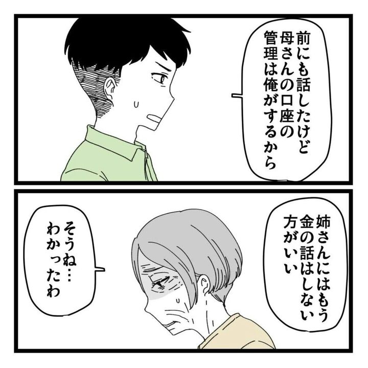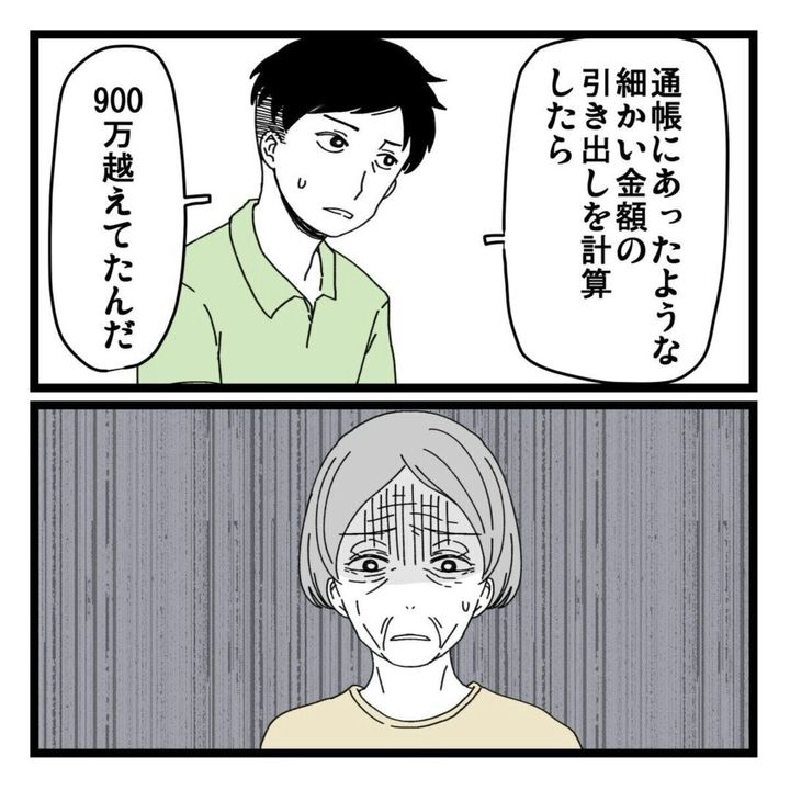 夫と2人暮らしの主人公・ほぺ美さん。義母は隣町で1人暮らしをしており、高齢です。そのため、夫と義姉とで義母の生活をサポートしていました。ところがある日、「銀行のお金が減ってる気がする」と義母から相談されたほぺ美さん夫婦。お金は義姉が管理しているはずですが…。山吹いろさん(@yamabuki___io)による作品『8桁の使途不明金』をダイジェスト版でごらんください。
