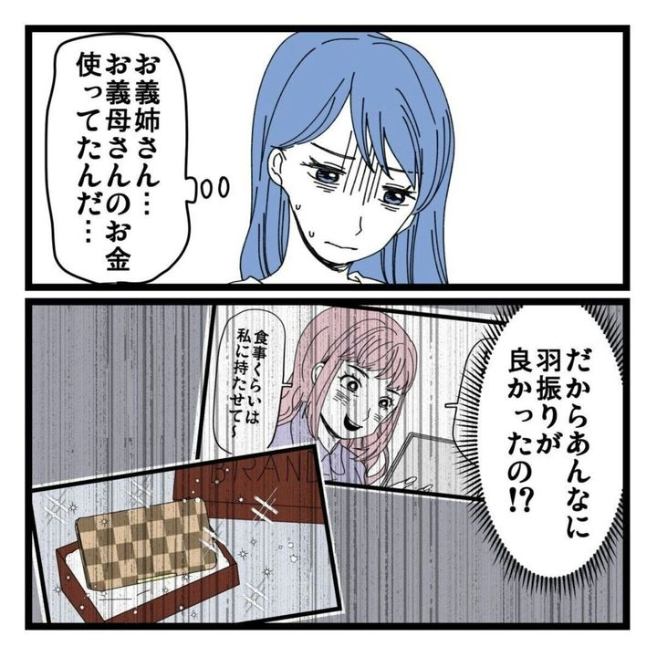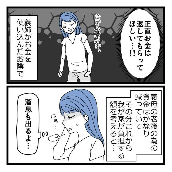 義姉が使い込んだ金額を義母へ伝えたほぺ美さん夫婦。義母の力が抜けうなだれる姿、見ている方もツラくなってしまいますね。1000万近い金額に加え、義母にとっては実の娘に裏切られてしまったことになります。