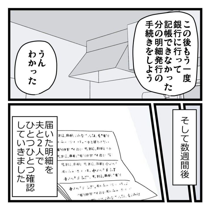 義母から相談され、すぐに記帳をし事実確認をしたほぺ美さん夫婦。キャッシュカードを止め、さらに過去の明細についてもきっちりと調べました。身内だからこそ、信頼して通帳を預けていたのに…。言葉もありません。