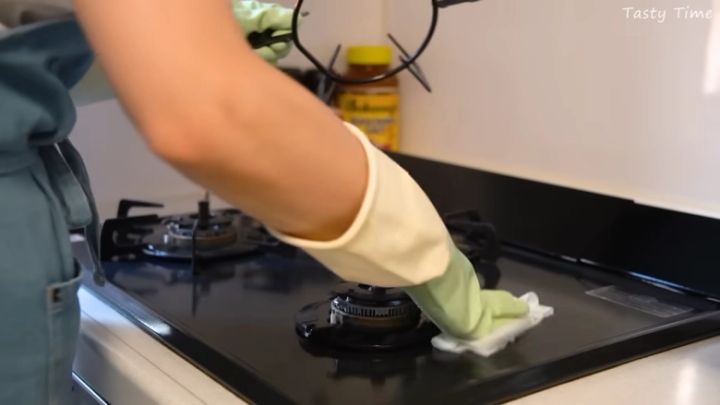 大判サイズで厚めのしっかりとした生地なので、力を入れて思いっきり掃除できるのがポイント。コンロ周りの汚れもしっかりと落とせます。