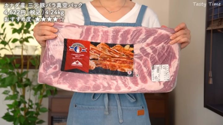 コストコの三元豚の豚バラ肉は、カナダから日本まで冷凍されずに届くとのこと。輸送期間に熟成されることで、肉質が柔らかくなるそうです。
