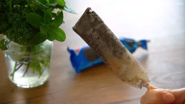 このオレオでもアレンジレシピを♪袋のまま砕いたクッキーに割り箸を差し込み、牛乳を注いで口を閉じます。そのまま1日冷凍庫で凍らせるだけで、なんとオレオアイスができちゃうんです!