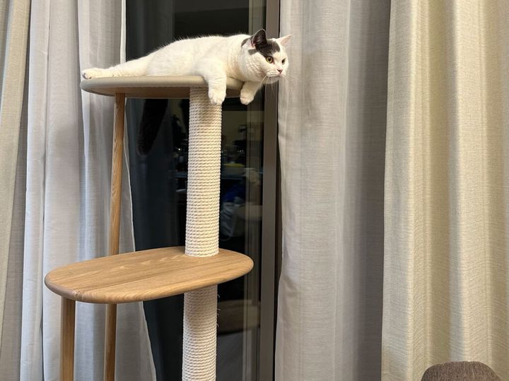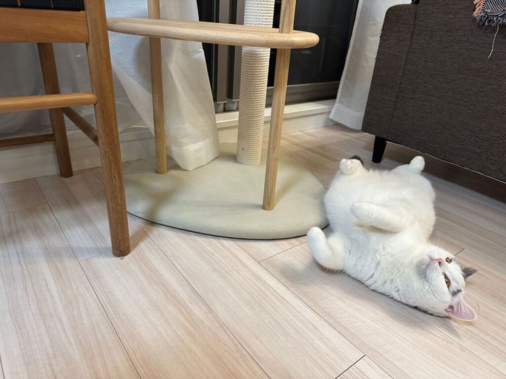 おとうちゃんがボクにニューアイテムを買ってくれたよ。その名も「カリモクキャットタワー」。爪研ぎしやすいし、なんかフワフワしてるし、最高なんだ。すぐにボクのお気に入りになったよ。