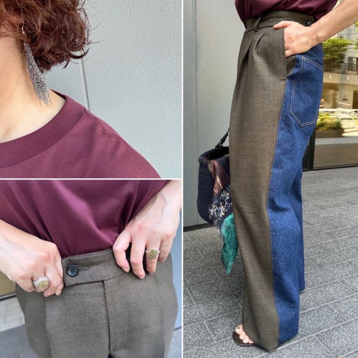 「スローン×ヴェルメイユ パー イエナの別注カラーTシャツは、ウールとデニムがドッキングしたアンスクリアのパンツを合わせ、どこか秋を思わせるカラーの掛け合いを楽しみました。耳元にはキャビアのような細かいツブツブがユニークなジャンフランソワ ミミラのピアスをつけて、ハンサムな雰囲気の中にさり気なく女性らしさをプラス」