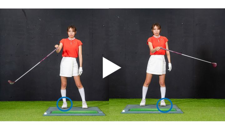 次に、振り子運動をしながら、自分も左右に動いてみましょう。右足に体重を乗せたら、左足に乗せていきます。それを繰り返すと、先ほどよりもクラブが大きく動くことが分かるでしょう。体全体を動かすことで、クラブと体の連動感が生まれます