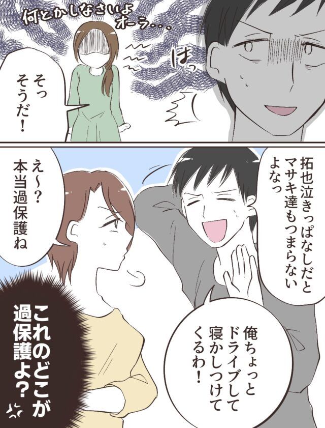 「拓也泣きっぱなしだとマサキ達もつまらないよな!俺、ちょっとドライブして寝かしつけてくるわ!」