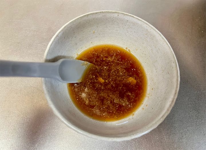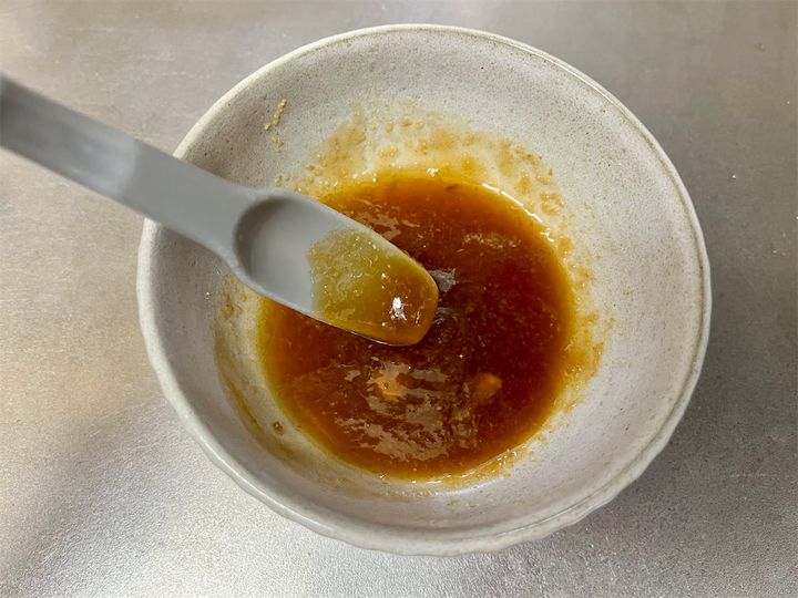 レンジ加熱でいい感じにとろみがついたタレからは、食欲をそそるにんにくのいい香りがしてきました。