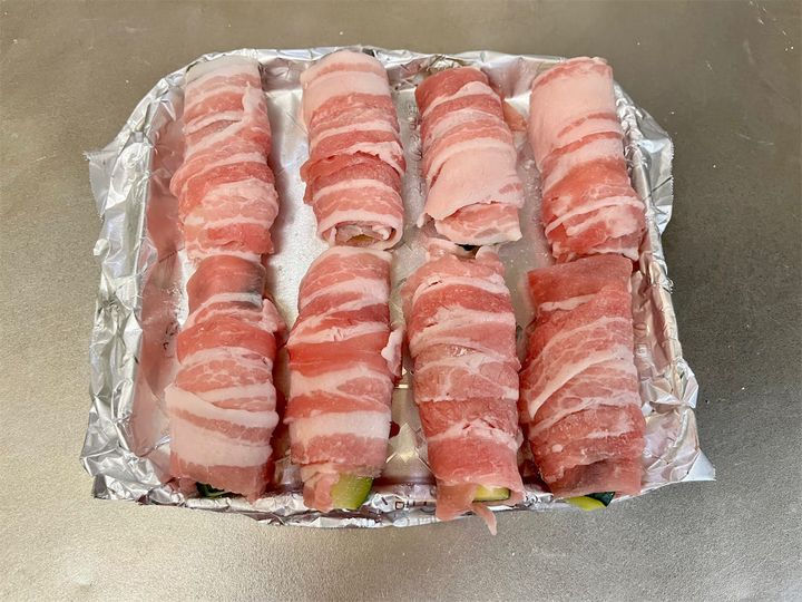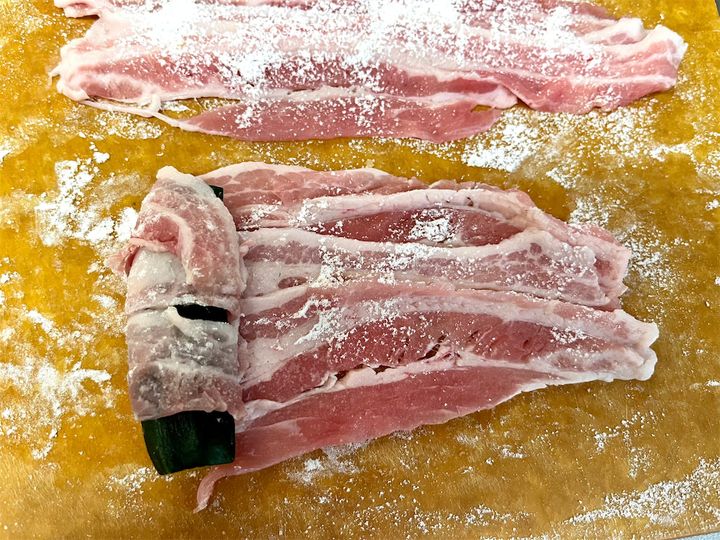 ズッキーニに豚肉をくるくると巻きつけていきます。