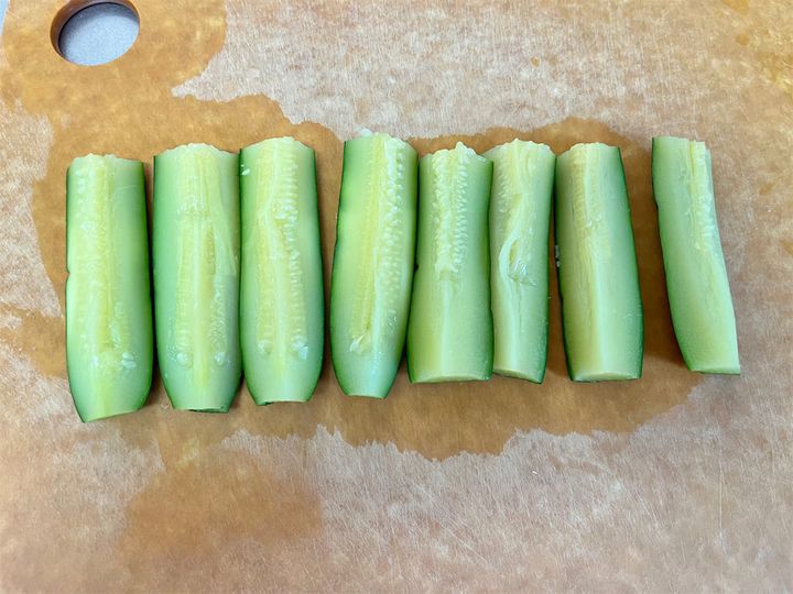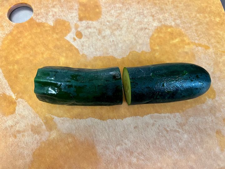 3. 1のズッキーニのラップをはがし、両端を切り落として横半分にカット。