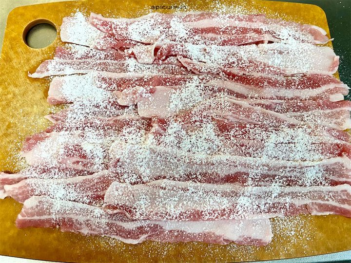 4. 豚バラ肉を広げ、両面に薄く小麦粉をまぶします。