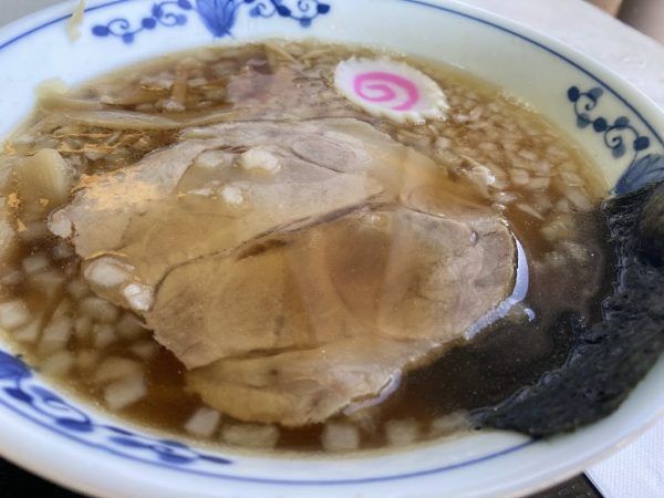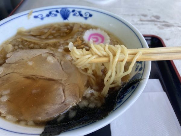 麺は少し細いタイプ。スープは玉ねぎがたくさん入っているせいか甘めです。シャキシャキの玉ねぎの食感がたまらなく美味しい〜!