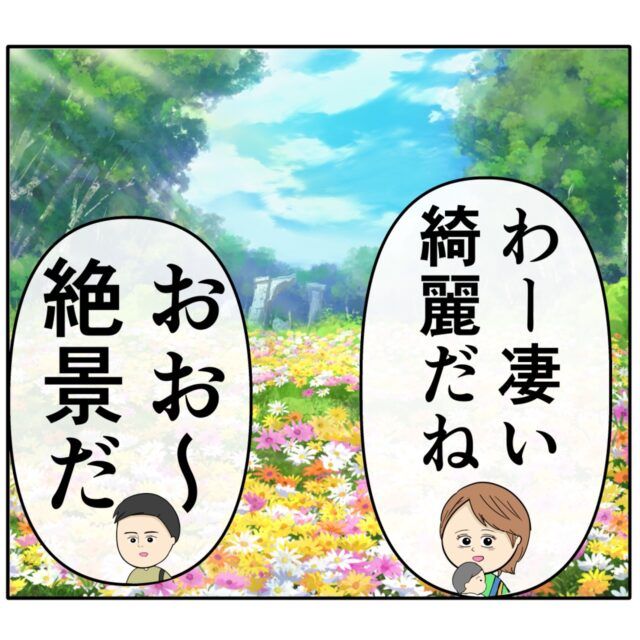 良い天気の週末に家族で公園へ出かけ、お花畑を見るのはとっても素敵なことですが、良し男さんとすみれさんの心で思っていることがすれ違っていて寂しいです。