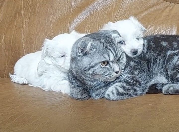 猫さんに甘えて一緒に眠りたい子犬さんたち。