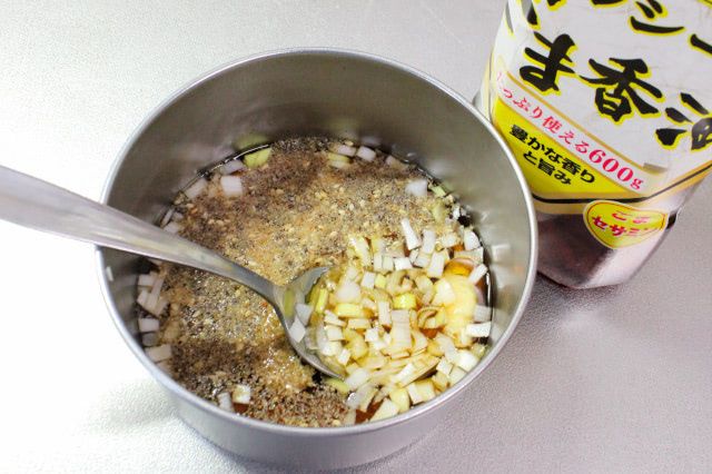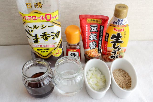 2. 長ねぎ、しょうが、豆板醤、ゴマ油、お好みでラー油、白すりゴマを加えて混ぜ合わせます。