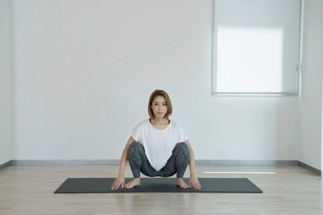 (3)しゃがみきったら胸の前で合掌して、ひじとひざを軽く押し合ってゆっくり3〜5呼吸(約30秒間)キープする