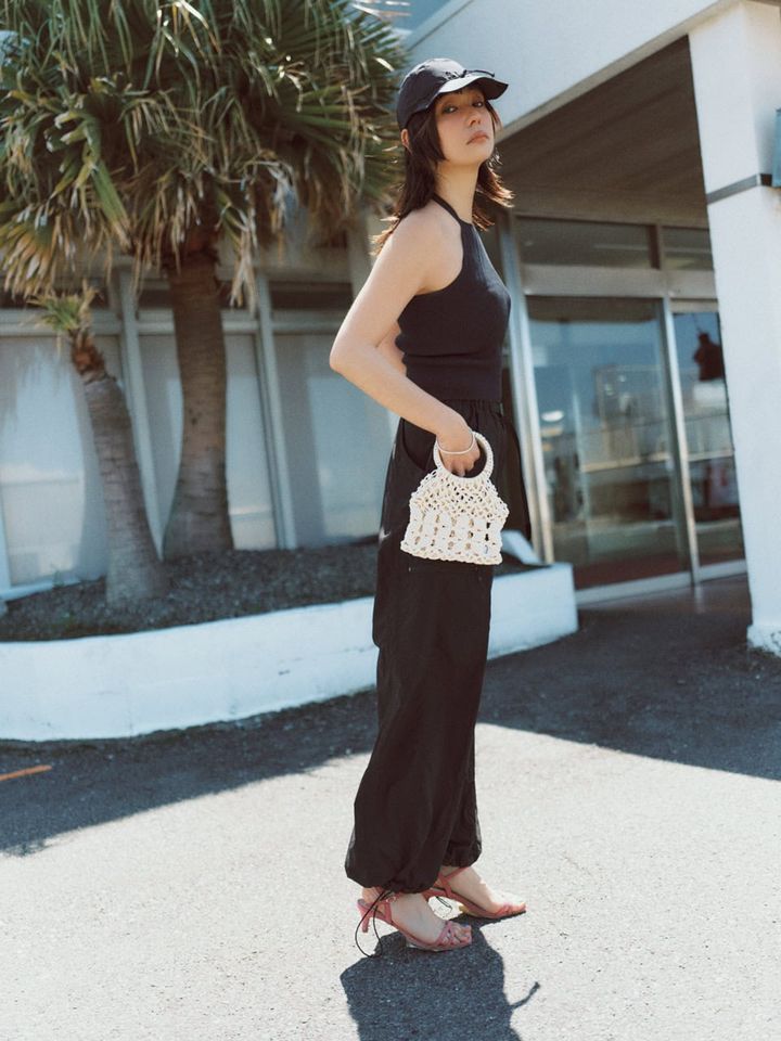 バルーンパンツ¥15,400(グラミチ/インス)、リブトップス¥13,200(エイチ ビューティー&ユース)、バングル¥16,500(ニナ・エ・ジュール)、バッグ¥9,900(バリ・ワークスタット/共にショールーム ロイト)、サンダル¥9,020(ラウナレア/ウフ)