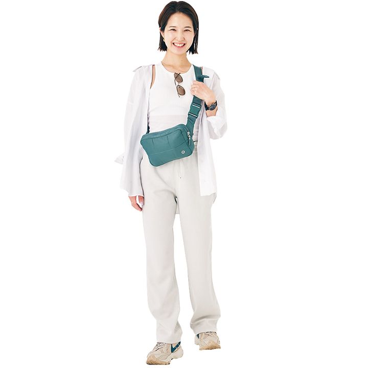 スポーティスタイルがお得意な公園ママは、2歳と10カ月の子どもの必須アイテムを全部斜めがけバッグに詰め込んで上手に手ぶら化。コツを伺いました!