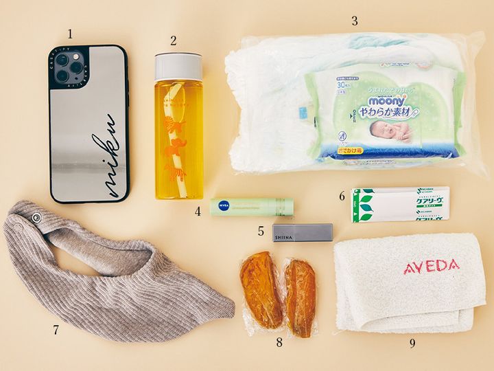 ❶スマートフォン ❷100均で購入した水筒。ストローの練習にもなります ❸おむつとお尻拭きは透明な袋に入れてスリムに ❹ニベアのリップクリーム ❺SHIINA organicの口紅 ❻絆創膏は公園に行く時の必需品。内ポケットに入れておくと安心 ❼スタイはシンプルなくすみカラーが可愛い ❽手作りの干し芋をラップに包んで公園で食べることも ❾ハンカチは厚手のタオル生地を