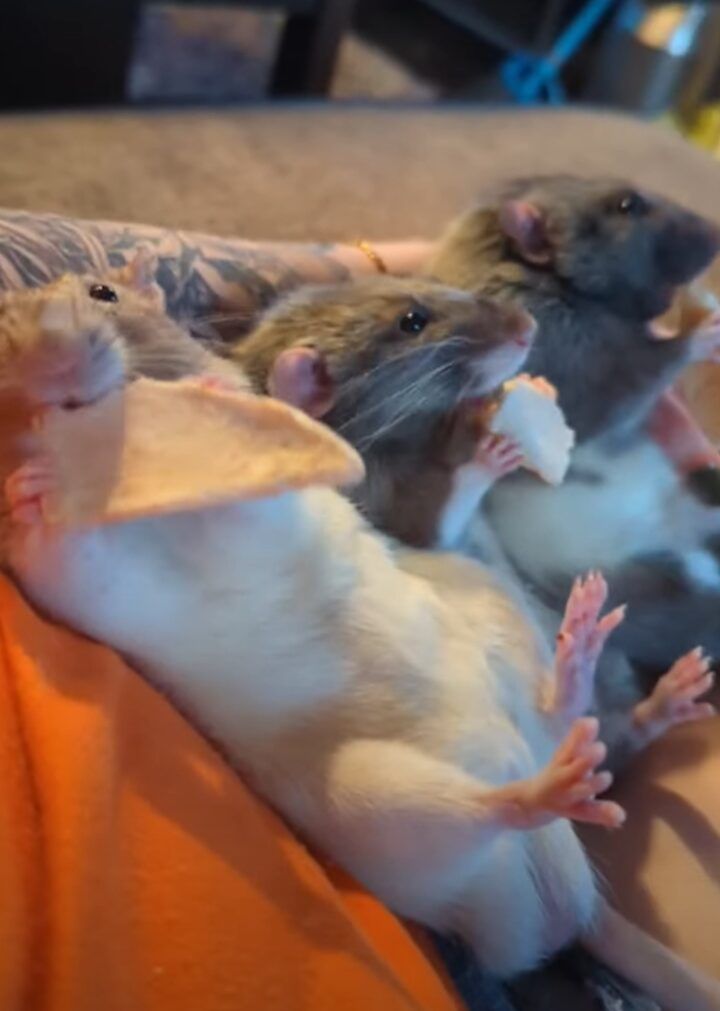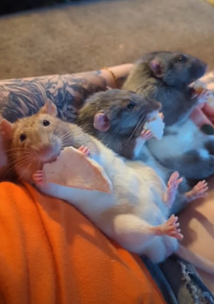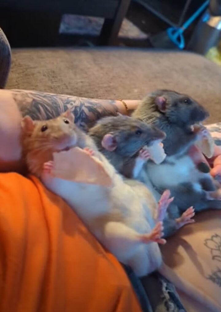飼い主さんの腕で仲良く寝転がる3匹のネズミたち。 おやつに夢中になっている愛らしい様子をご紹介します。
